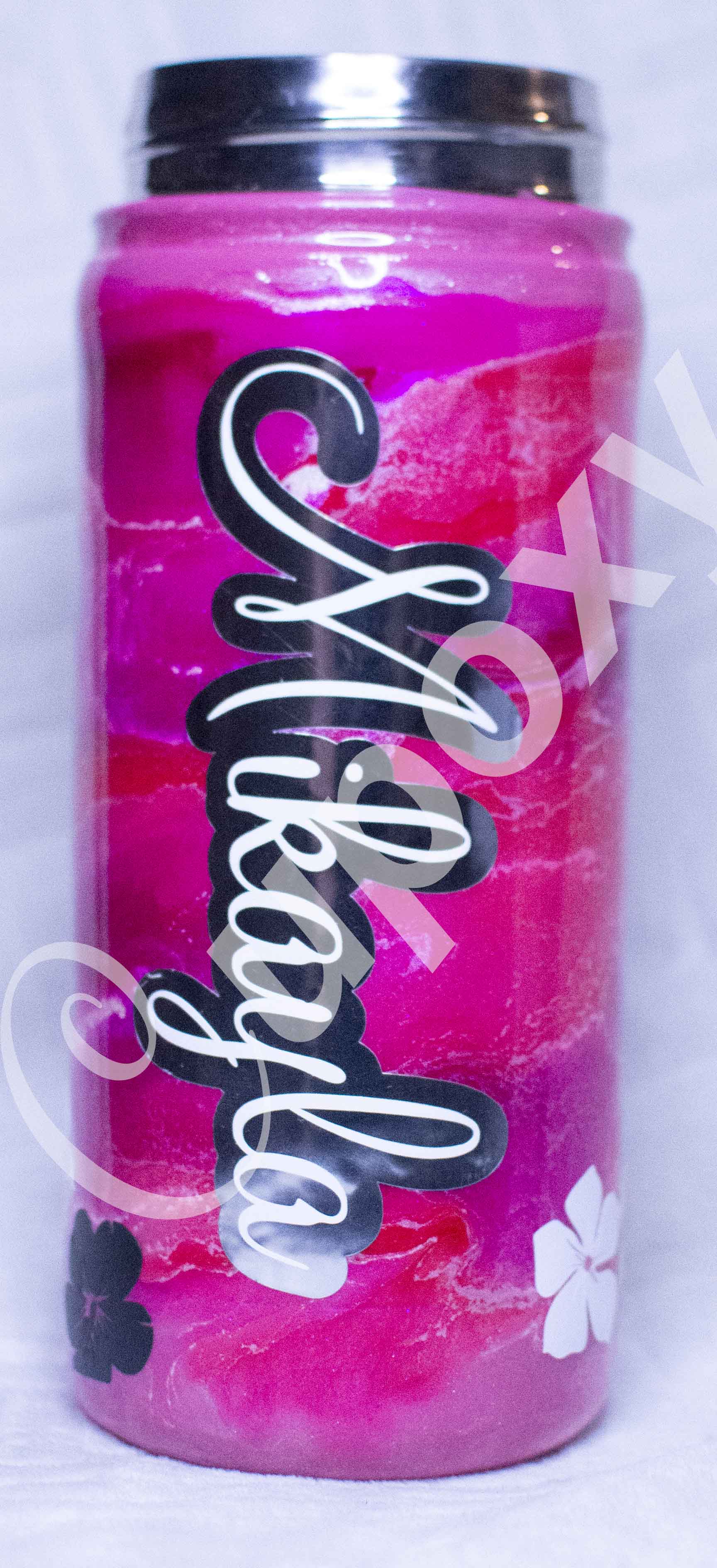 Tumbler Colors: shades of pink with white. Name in mirror vinyl with white on top with black and white flower images.